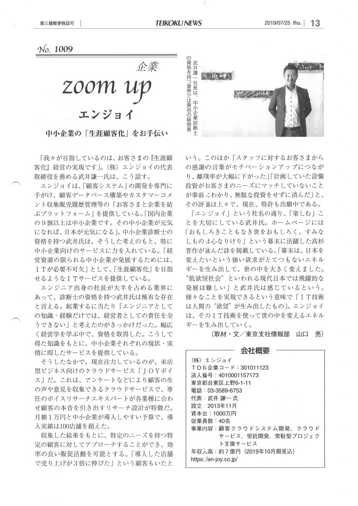 当社が帝国データバンク発行日刊 帝国ニュース(2019.7.25号)に「ZOOM UP企業」として掲載されました。
